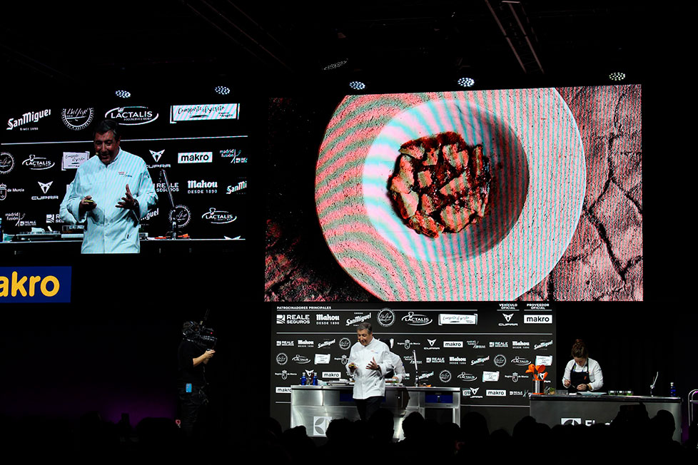 毎年研究発表に余念のないエレナ・アルサックは、今回、果汁などに含まれる自然の酵素を利用して、肉や魚を軟らかく仕上げる技術を紹介。やはり毎年会場を満席にするアンヘル・レオンは、釣り餌に使うミミズを食用にして見せた。野菜の色素の発表をしたガリシアのシェフ、ルシア・フレイタスの4色の料理は印象に残る美しい料理だったが、彼女は一ツ星店をほぼ女性ばかりのスタッフで回しているという。男女格差が急速に縮まってきているスペインならではの一幕だった。
