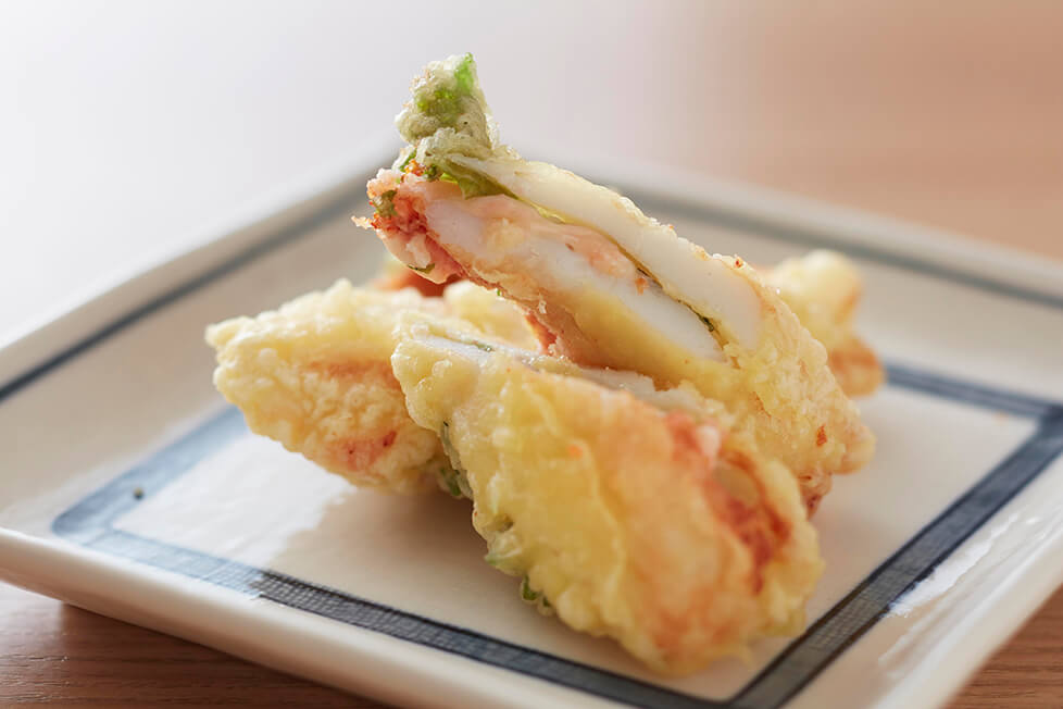 3) 天ぷら粉を水(分量外)で溶き、2)をくぐらせて170℃の油でカラリと揚げる。