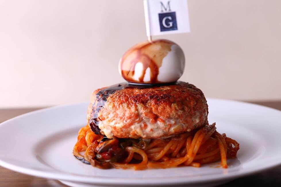 皿にナポリタン、パティ、卵の順に盛り、ソースをかける。