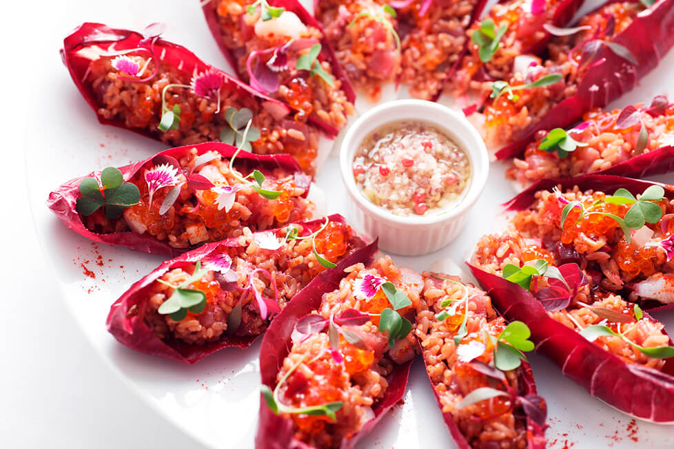 タルティーボ・ラディッキオの中に4を詰め、イクラを散らし、赤パプリカパウダーを振る。