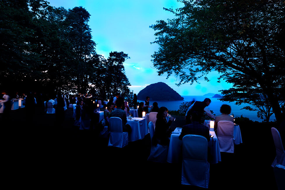 ディナー会場は、棟方志功が作品に描いた浅虫温泉の湯ノ島を望む陸奥護国寺。写真は会場から見える景色。