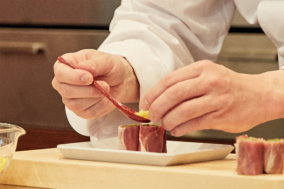 柳原:生ハムには、日本伝統の食材にはない強い個性があります。でも日本料理はもともと素材を生かす料理であり、旨味や発酵の風味を扱うのにも長けた料理です。今回は素材の持ち味を生かしつつ、和の食材と合わせていかに和食に仕立てるかが重要だと考えました。