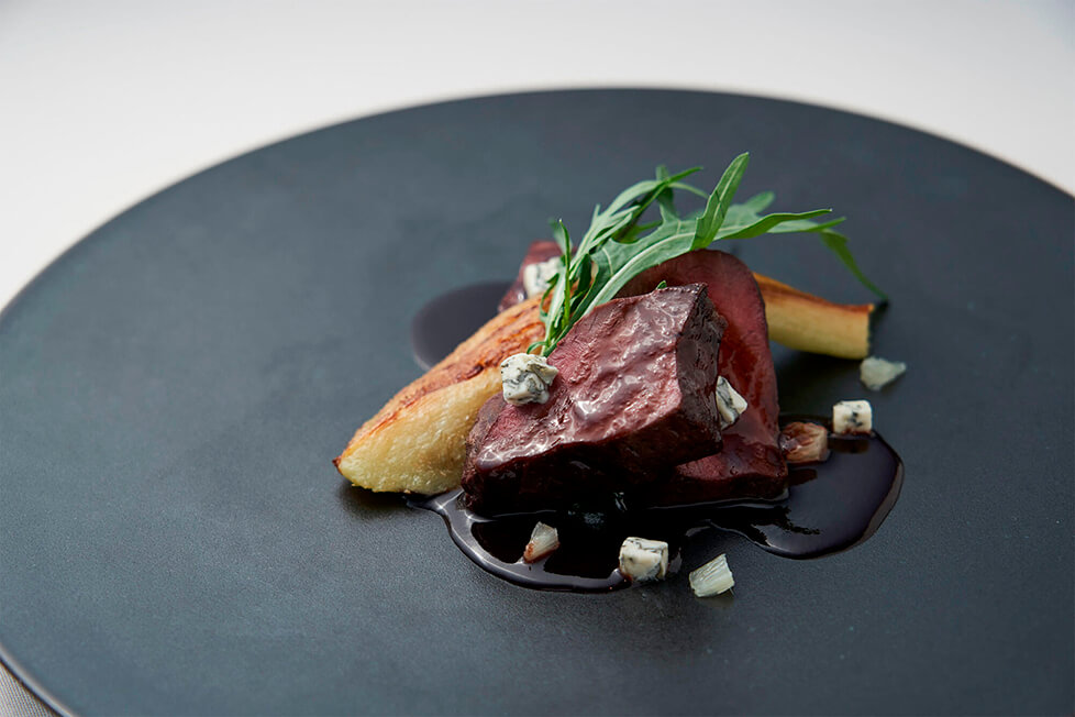 心臓はシンプルにソテーし、独特の香りをロックフォールチーズでカバー。ライムで爽やかさを与える。歯応えがある心臓に揚げナスという食感の対比を演出。糖質制限中でも赤ワインや蒸留酒はOKなので、ソースに赤ワインを使用。渋味のある赤ワインと好相性なひと皿に仕立てている。