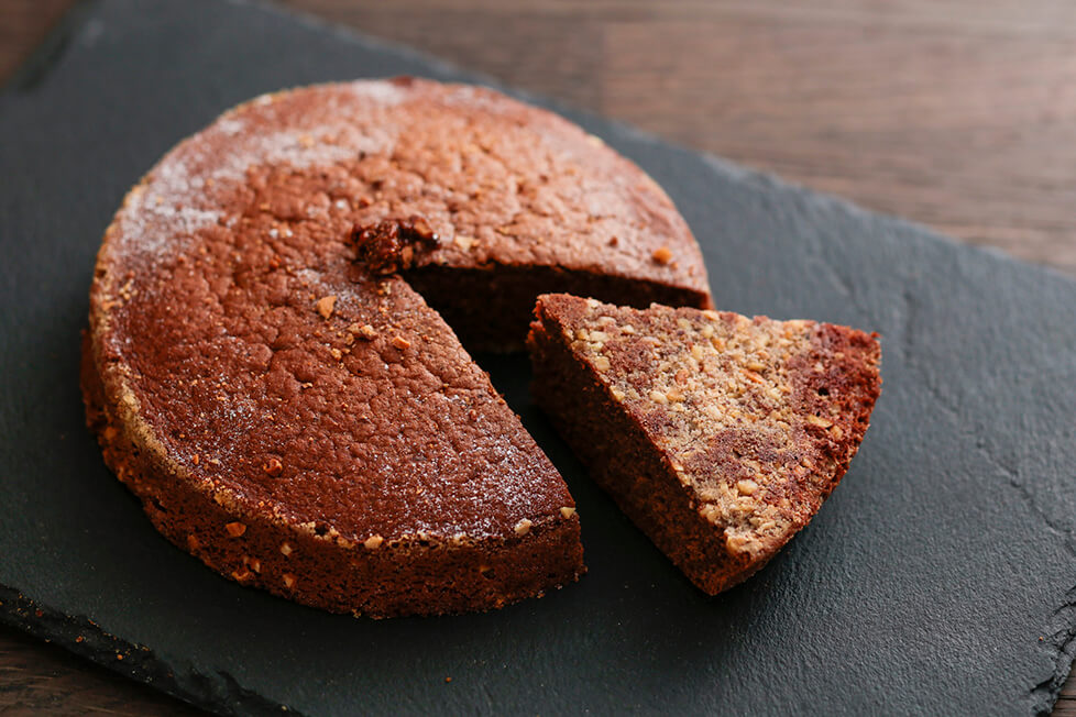 シリアルをタルト生地のように底に敷き詰めたケーキ。シリアルは噛みしめるほどに滋味深くザクザクした食感。ビスキュイはふわっと柔らかく、ヘーゼルナッツの香ばしさが際立つ。