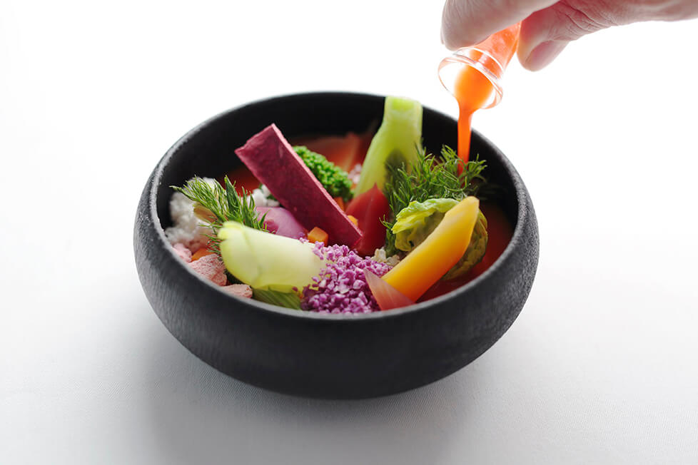 ビタミンやポリフェノールを多く含む緑黄色野菜をふんだんに使った色彩豊かな前菜。流しかけているのは、ヴェルヴェーヌをアンフュゼしたニンジンとオレンジのスープ。底にはキヌアがたっぷり。