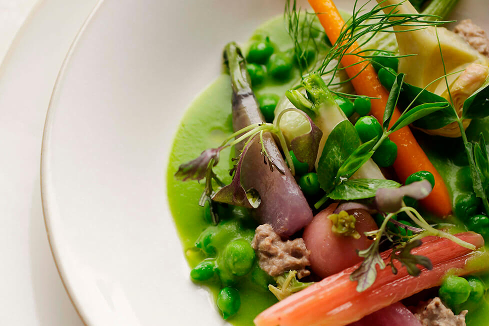 「季節野菜のミジョテ」。ミジョテとは弱火でことこと煮る調理法。ごく少量の昆布だしで煮ることで野菜のエキスを引き出し、その水分はすべて野菜に絡み戻す。濃厚なクルミとキノコのピュレ、グリーンピースの香りがはじけるソースを添えている。