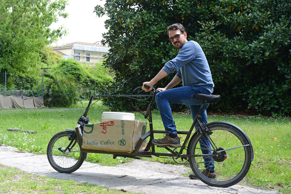 アントニオ・ディ・ジョヴァンニさん。コーヒー豆のかすを回収する改造自転車に乗って。