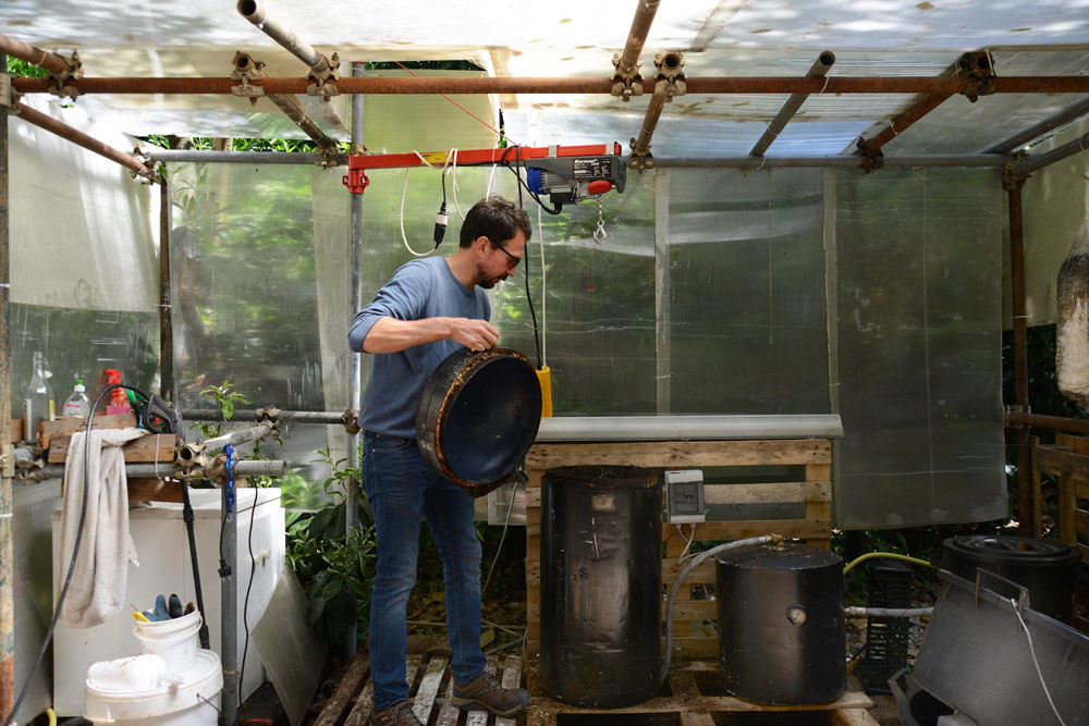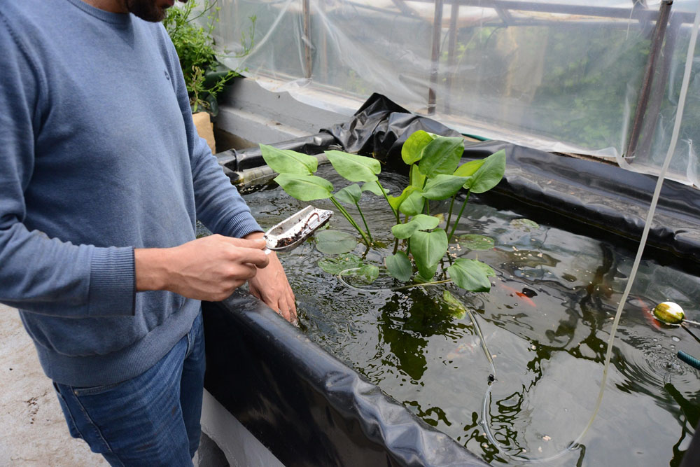 ミミズの使い道はそのほかに、釣りのエサとしても売却しているが、アントニオ氏はアクアポニック(水耕栽培と水産養殖の循環型農法)にも繋げている。水槽で飼育する鯉にミミズをエサとして与え、その鯉が排泄する有機物を含んだ水はフィルターを通ってハイドロボールを敷き詰めた菜園に撒かれる。植物(野菜、ハーブ、花)はその水から養分を吸収し、残った水(およそ9割)は再び鯉の水槽に戻る。こうすることで土と水の消費を極力抑えた農業のサイクルが出来上がる。まだ試験的な段階だが、土の利用ができない場所、特に街中でのアーバン・ファーミングの将来性は十分あると感じている。