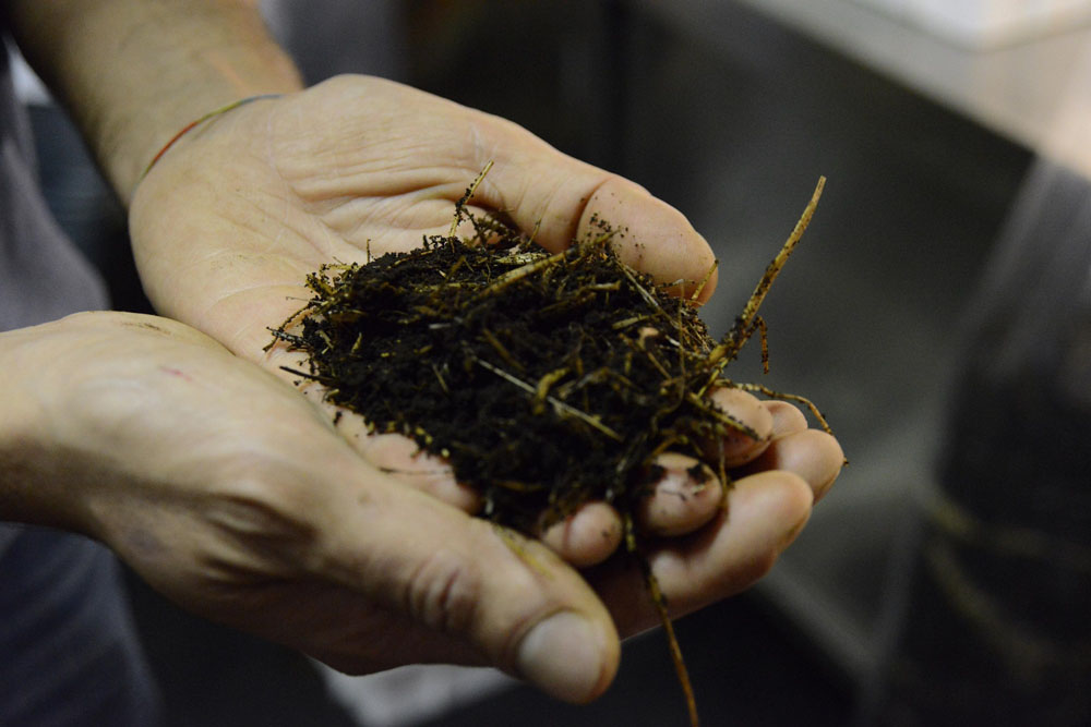 アントニオ氏が目指す持続する再生、再利用のシステム、サーキュラー・エコノミーの観点においては、「コーヒー豆のかすを利用したきのこ栽培」はスタート地点である。次は、きのこを収穫し尽くした後の栽培地を第二ステップに移さねばならない。そこで登場するのがミミズである。使用済み栽培地をコンポストに入れると2、3日後、発酵が始まり、70度くらいまで急激に温度が上がる。30日ほど経過して発酵がおさまったらミミズを投入する。繁殖力の強い小型のミミズなので数はどんどん増え、その分使用済み栽培地の堆肥化も進む。こうしてコンポストに移動させてから約6ヶ月後、キロあたり70ユーロと高額で売却できるミミズ堆肥が完成する。「フンギ・エスプレッソ」では一ヶ月に約100キロのミミズ堆肥を生産しており、これは重要な収入源となっている。