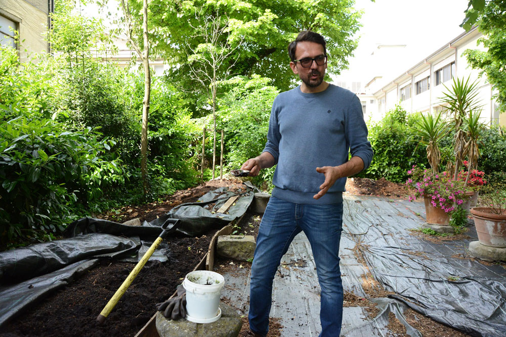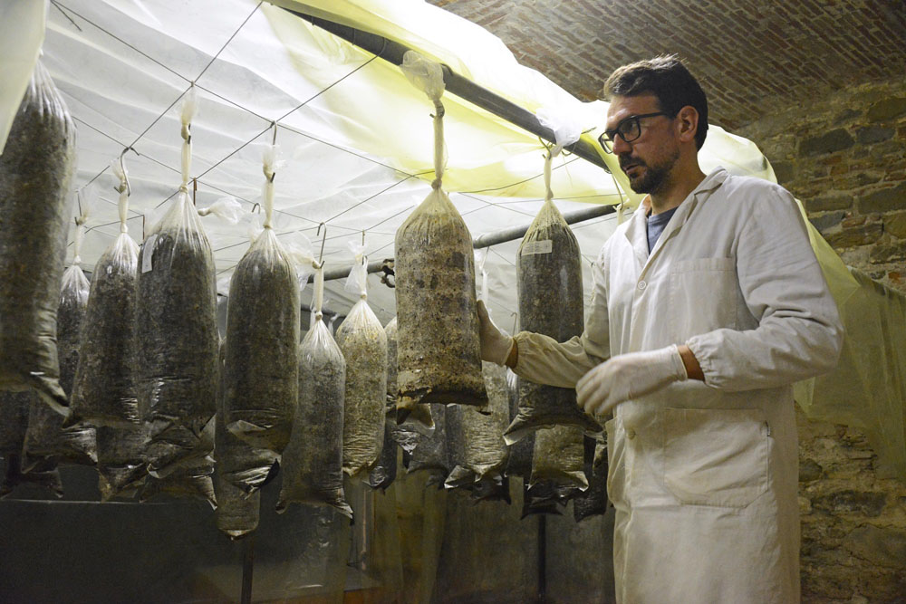 「イタリアは言わずと知れたエスプレッソコーヒーの国。朝の一杯がなければ一日は始まらないし、人間関係の潤滑油としても不可欠。というわけで、どんな小さな村にも必ずバールがある。そして、全国にある11万軒のバールからは、抽出済みコーヒーのかすが毎年30万トンも出るが、これらは単なる廃棄物として処理されているんだ。日々捨てられるだけの大量のコーヒー豆のかすが、実はきのこが好むミネラルや栄養素をたっぷり含んでいることはイタリアではまだまだ認知されていない。だから、まずはバールを回って、このゴミを再利用する仕組みを説明することから始まった。現在は、賛同してくれた6軒を毎日夕方5時ごろに行って回収している。環境負荷ゼロを目指すわけだから移動手段はもちろん自転車。遠いところでは20キロ離れたところまで行って、合わせて60キロのかすを回収してくるんだ」。
