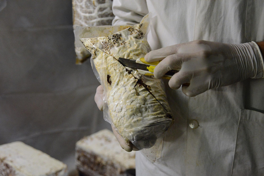 きのこの形がうっすらと見え始めていたら、蛍光灯を灯した部屋に移し、袋に切り込みを入れてきのこが生えてくるのを手助けする。この栽培室の温度は15〜20度、湿度は90%、炭酸ガス濃度は1000ppm以下を保つようにしている。