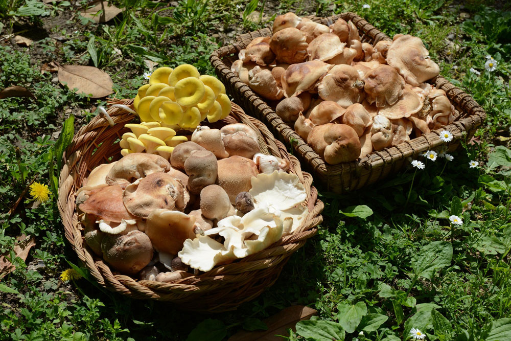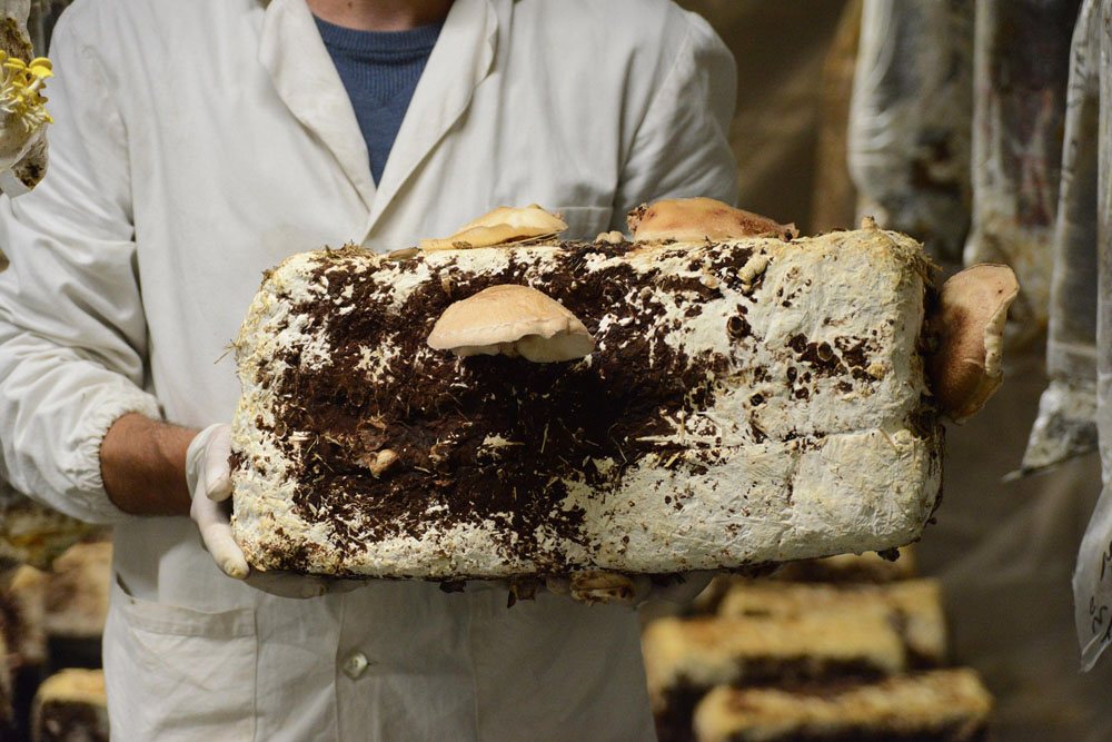 黄色はタモギダケ、茶色がシイタケ、白っぽいのがヒラタケ。化学薬品などは一切使用していないが、イタリアの規定では土を使わずに栽培した場合、有機(ビオ)の認定は受けられないし、コストもかかるので申請する予定はない。