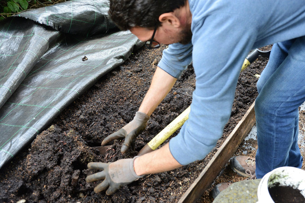 ミミズ堆肥の現場。ミミズは繁殖の早い「ロッソ・カリフォルニアーノ」