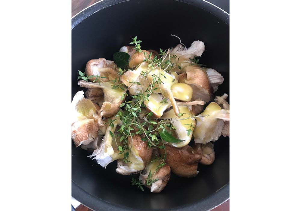 シイタケをオリーブオイルとハーブで蒸し焼き。日本のシイタケとは風味が少し異なるが、じんわりとした旨み、肉厚で、ポルチーニにも似た食感があり、後を引く。