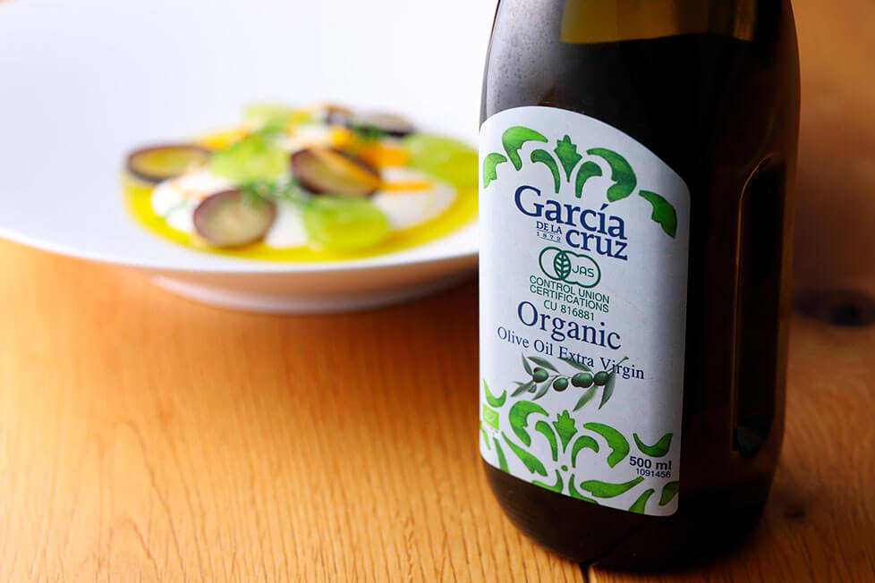 紹介したのは、クセがなく食べやすいスペイン産のチーズ「アルスアウジョア」をヨーグルトと生クリームでのばし、旬のブドウ、「ガルシア」を調和させた前菜だ。「ガルシア」が加わることで、フレッシュな印象にコクと香りが加わり、風味が格段に奥深く変化する。「スペイン料理では、調味料感覚でオリーブオイルを仕上げにどんどんかけます。ガルシア 有機エクストラバージンオリーブオイルは日本人に馴染みやすい穏やかな風味ですから、スペイン風に、日々の料理にかけるのにおすすめです」。今回の料理をヒントに、シリアルとヨーグルトにかけても、また豆腐や焼き魚に醤油をたらすように「醤油とオリーブオイル」をかけても味わいが広がりそうだ。そんな懐の深さを、ガルシア 有機エクストラバージンオリーブオイルは備えている。