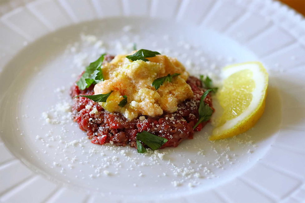 常陸牛モモ肉は表面をさっと焼き、細かく叩く。さっぱりと味わうためにもう一工夫。地元農家産の水ナスと桃を、パルミジャーノ・レッジャーノ、オリーブ油、レモン汁、塩で和えたものを添えた。「肉には塩をしていません。肉そのものの純粋な味を楽しむもよし、付け合わせやおろしたチーズ、レモン汁とともに味わうもよし」。桃も水ナスも甘味が豊かで、チーズの風味やレモンの爽やかさとともに常陸牛の旨味を堪能できる。いわば“茨城版カルネ・クルーダ”が誕生した。