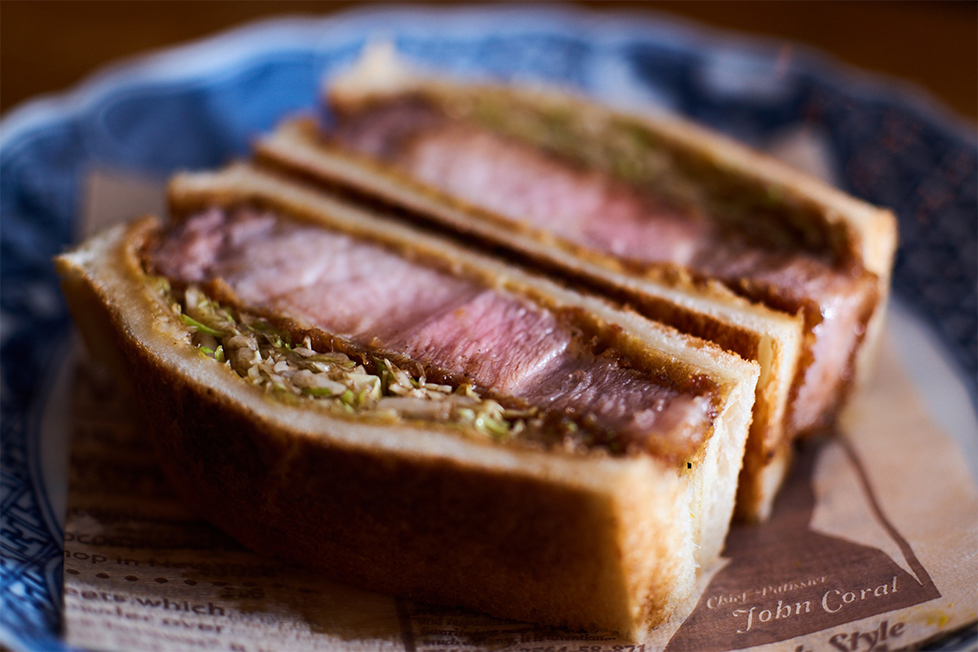 断面のローズピンクが美しいロースカツサンド。カツのソースはウスターと中濃を合わせて粘度を調整している。