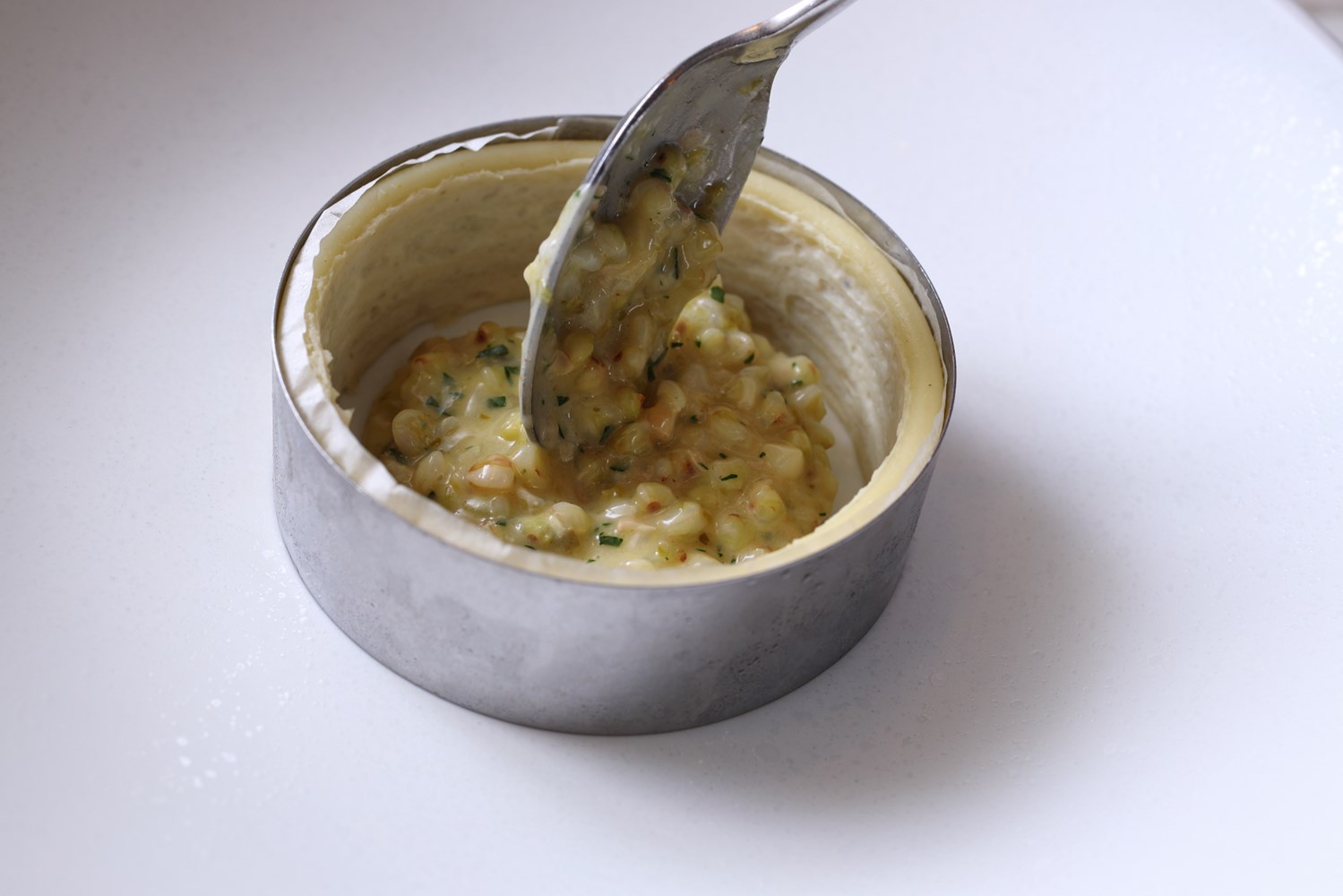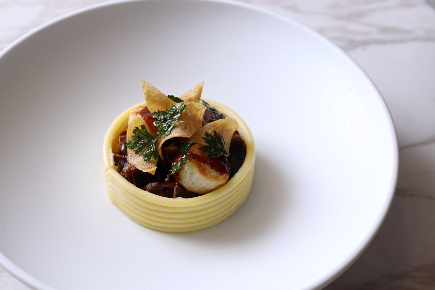 煌はスネ肉を使い、赤ワイン、フォンドヴォー、香味野菜、スパイスと共に4時間ほどオーブンで煮てエフィロシェ(繊維に沿って裂く技法)に。そばの実はバター、エシャロット、コルニッション、ケッパーと共に鶏のブイヨンで炊き上げる。セルクルの内側にパスタと鶏ムースを巻き、そばの実のリゾット、エフィロシェした煌、長芋を重ね、煌の煮汁を煮詰めたソースで仕上げた。