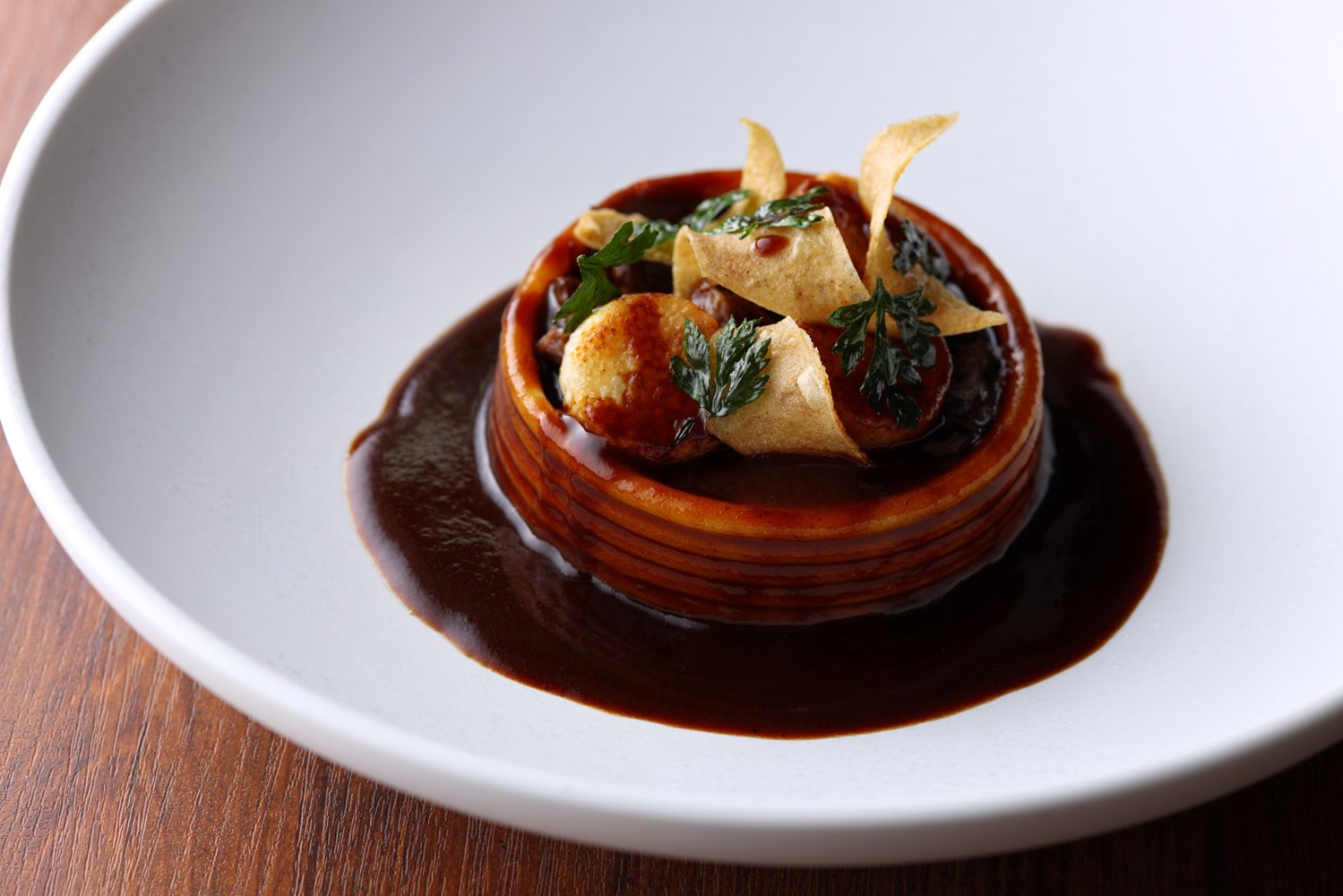 視察では「フランス料理で使うべき食材は何か?と考え、常陸牛 煌(きらめき)と常陸秋そばを選びました」と話す。長時間煮込んだ牛スネ肉の深い旨味にそばの実やそば粉といった和の要素を重ねた一皿を考案した。