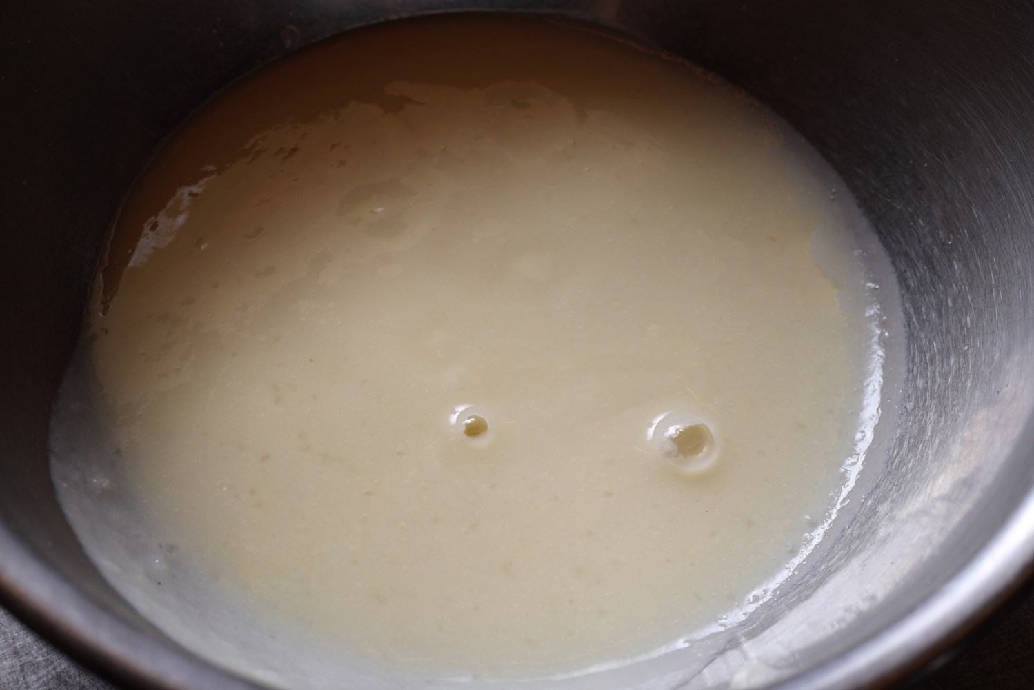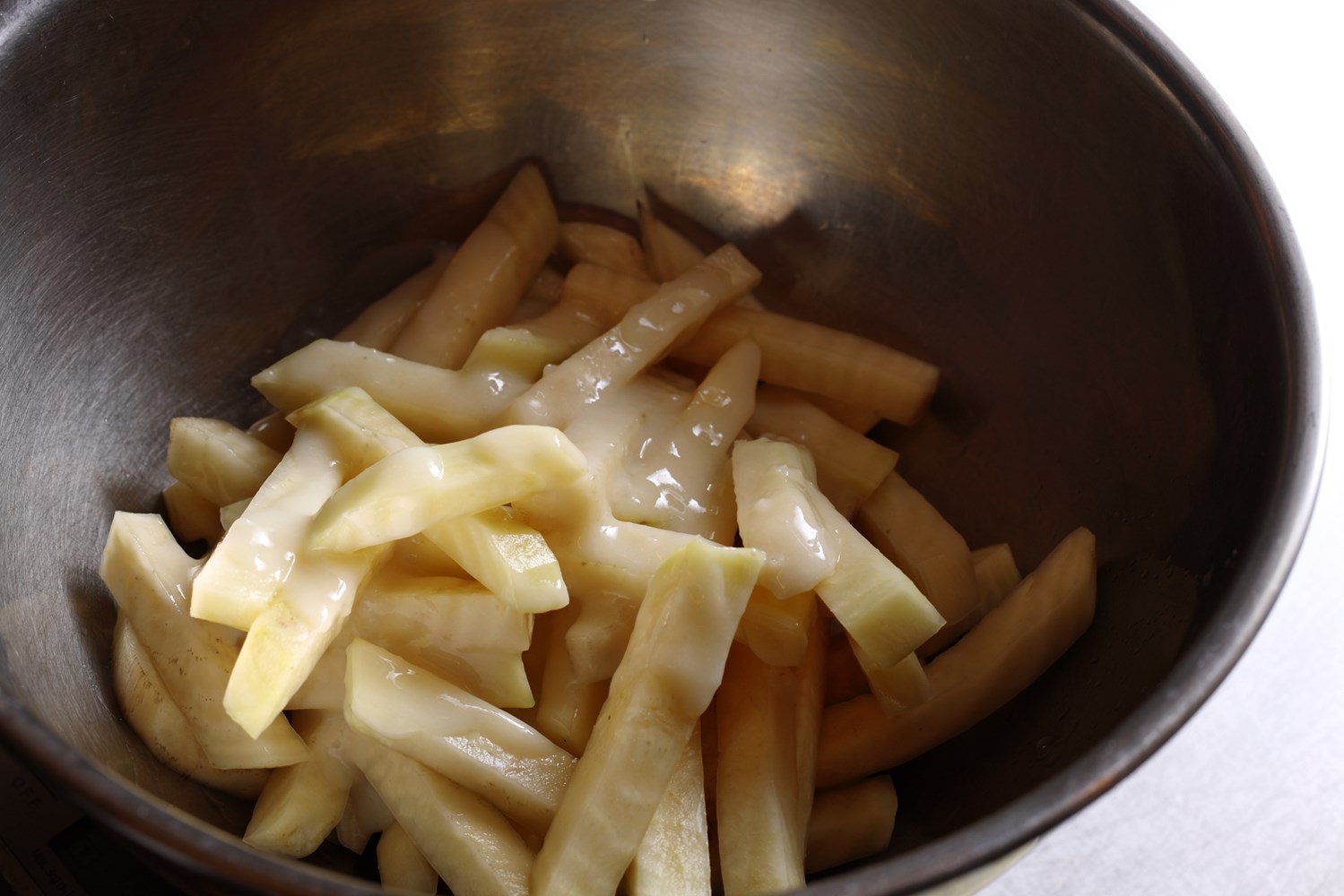 「塩こうじは素材の味や目的に合わせて塩分濃度を自分で調整できる点がいい」。今回仕込んだ塩こうじは同割の麹と水に対し塩は10%。毎日かき混ぜながら常温で1週間ほど置き、一度ミキサーにかけてから白ビーツと合わせている。「白ビーツはマリネする前に刻んで塩をまぶしてしばらく置き、水気を搾ります。そこで今回は塩分量を控えています」
