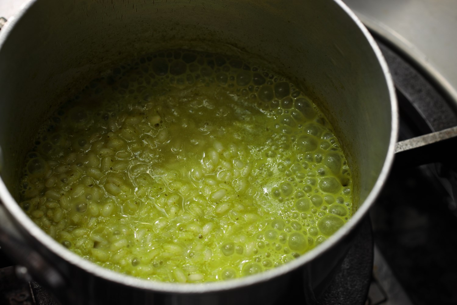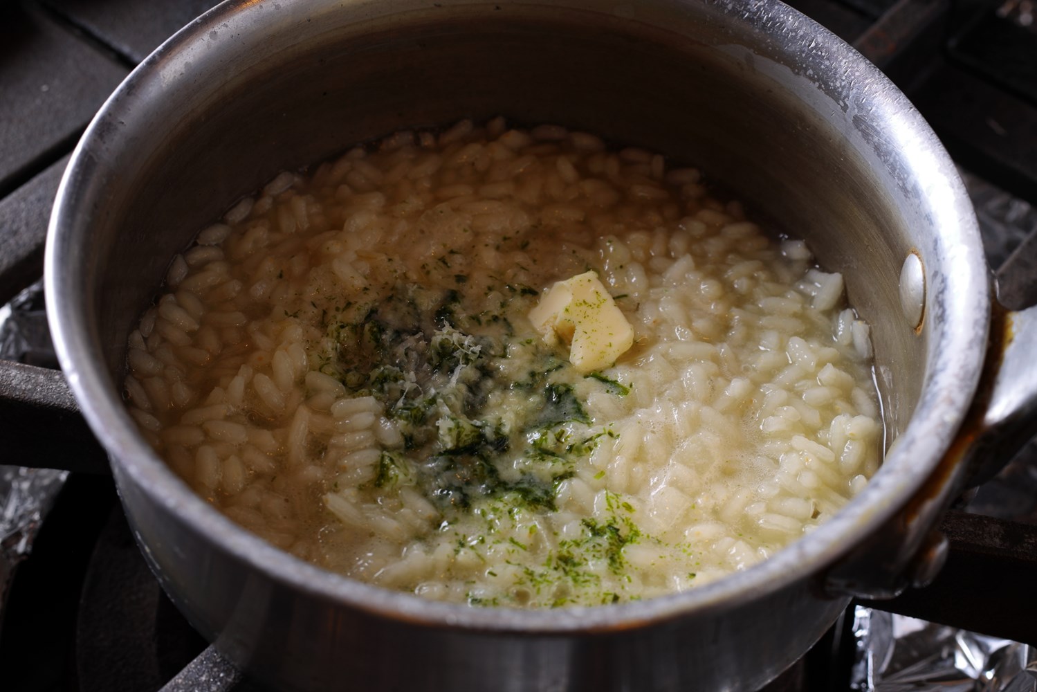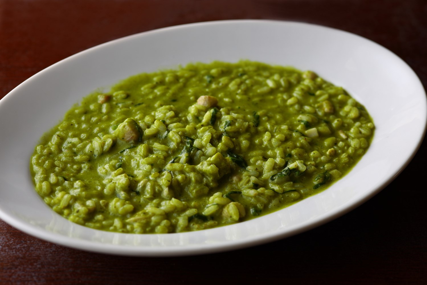 小松菜とルーコラは視察した笠間市にある有機野菜の生産者「ヴァレンチア」から。「小松菜もルーコラも味がとてもしっかりしています。野菜の旨味が強いので、ブイヨンは使わずに米を水で煮て、生クリームとペーストに入れたナッツ、ペコリーノチーズのコクで十分おいしい。ただ葉の柔らかいルーコラは生でリゾットに入れると溶けて香りが飛んでしまうので、仕上げる直前に追加して味と香りを活かしました」