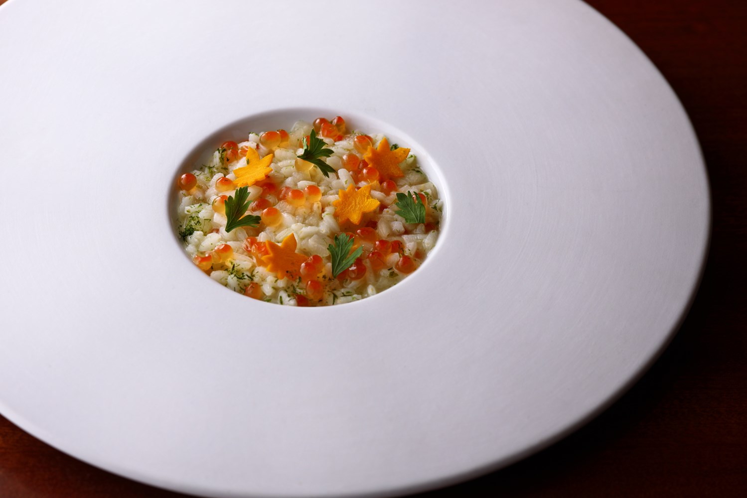 「イタリアの各地域では、ベリーや柿、リンゴなどの果物を使った軽い後口のリゾットがたくさんあります。僕はそれが好きで」。今回は、旬のいくらと梨を具に選んだ。