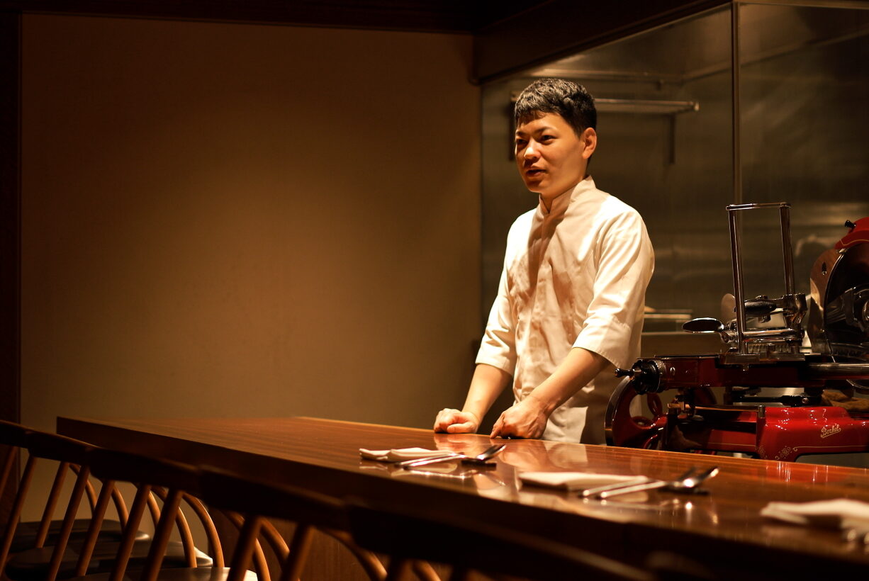 2年前にイタリアから帰国し、新富町に自店を構えた「プリモパッソ」藤岡智之シェフ。店内はマットで温かい印象の土壁、木製の格子天井が織りなす光の陰影、和な空間のカウンターキッチンに、艶やかな真紅のベルケル社製生ハムスライサーが鎮座する。