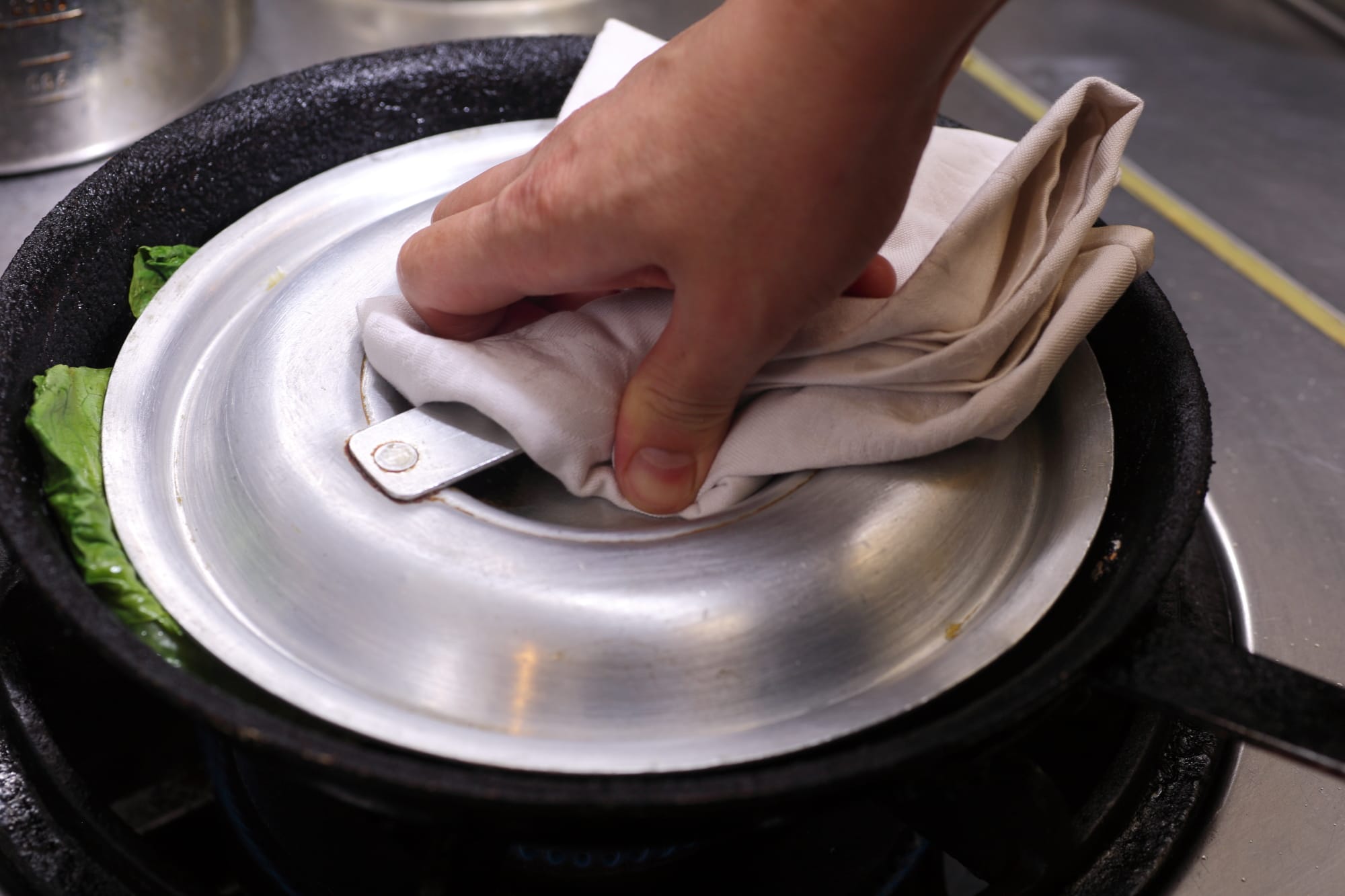 蓋で押し焼きすると短時間で焼き色がつき、上部には火が通り過ぎず、調度よく焼ける。