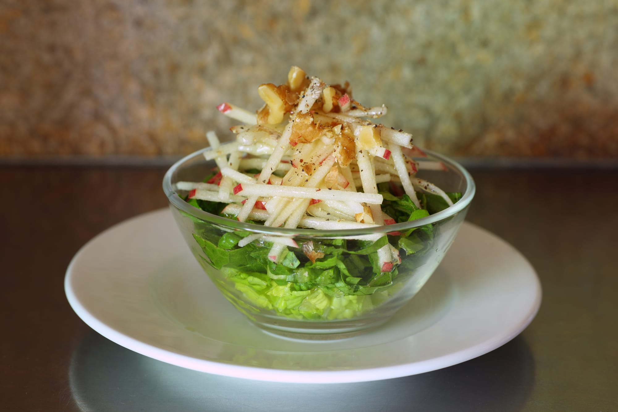5. 皿に2、3、4の順に盛り、キユーピー フルーツビネガードレッシング(アップル)をかける。