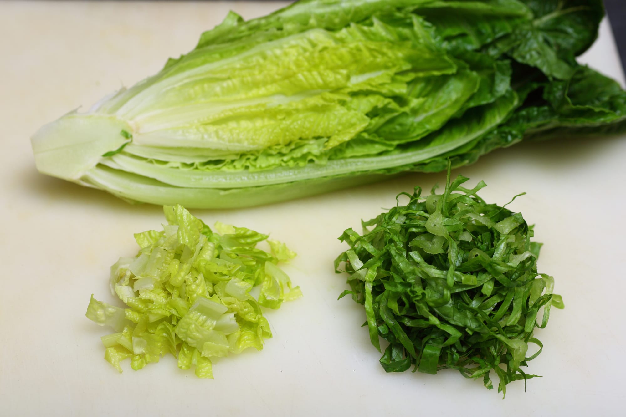 1. ロメインレタスの外側の葉12枚をはがし、葉先から18~20㎝の部分をカットする。芯の部分は切り取り、粗みじん切りにする。