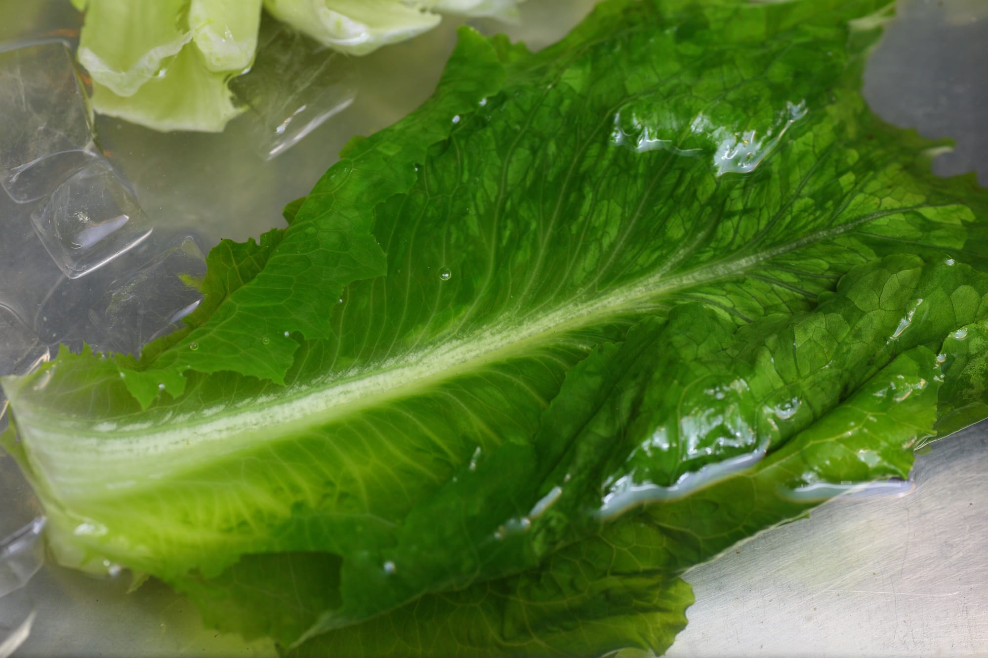 湯通ししたらすぐに氷水にとって色止めし、ロメインレタス本来の鮮やかな緑色をキープ。