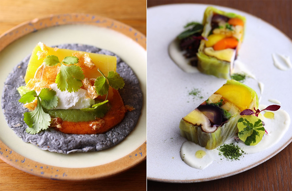 「使っているのは鈴木農場のキャベツや、さつまいも“めんげ芋”、ブロッコリー、ニッケイファームのニンジンなど11種の旬の野菜。それぞれ味や食感を生かして素材ごとに茹で、コンソメジュレとともにテリーヌ型で冷やし固めました。一皿でいろんな野菜の味と香り、食感が楽しめます。カリフラワーのピュレとキャラメリゼしたカカオニブ、180℃で乾燥させたホウレン草のパウダーはアクセントに添えました。野菜だけで成立している皿の美しさと力強さを、存分に感じて欲しい」