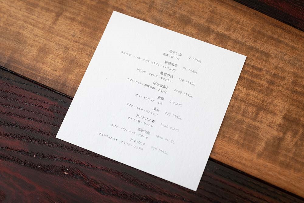左側の「砂漠海岸」や「熱帯雨林」が料理名、その下には使用されている主な食材、そして右側の数値は、“MBSL=水深、MASL=海抜”、つまり標高を表している。「ペルーの自然と生態系の多様性を表現する」というコンセプト通り、ペルーの特徴的な自然環境を食べて知るデギュスタシオンコースというわけだ。