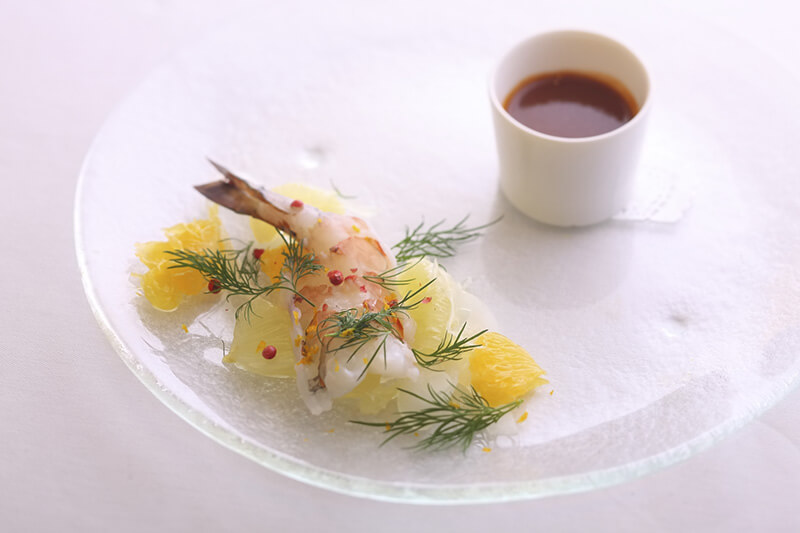 アシアカエビ、甘夏、サラダたまねぎで構成された春らしい一皿は、いずれも熊本県水俣・芦北産。3月12日に広尾「アクアパッツァ」で開催された「水俣・芦北フェア」のコースで提供された前菜です。このフェアに先駆け、2月下旬、日髙良実シェフはフェアで使う食材すべての生産者さんを訪ねる旅に出ました。