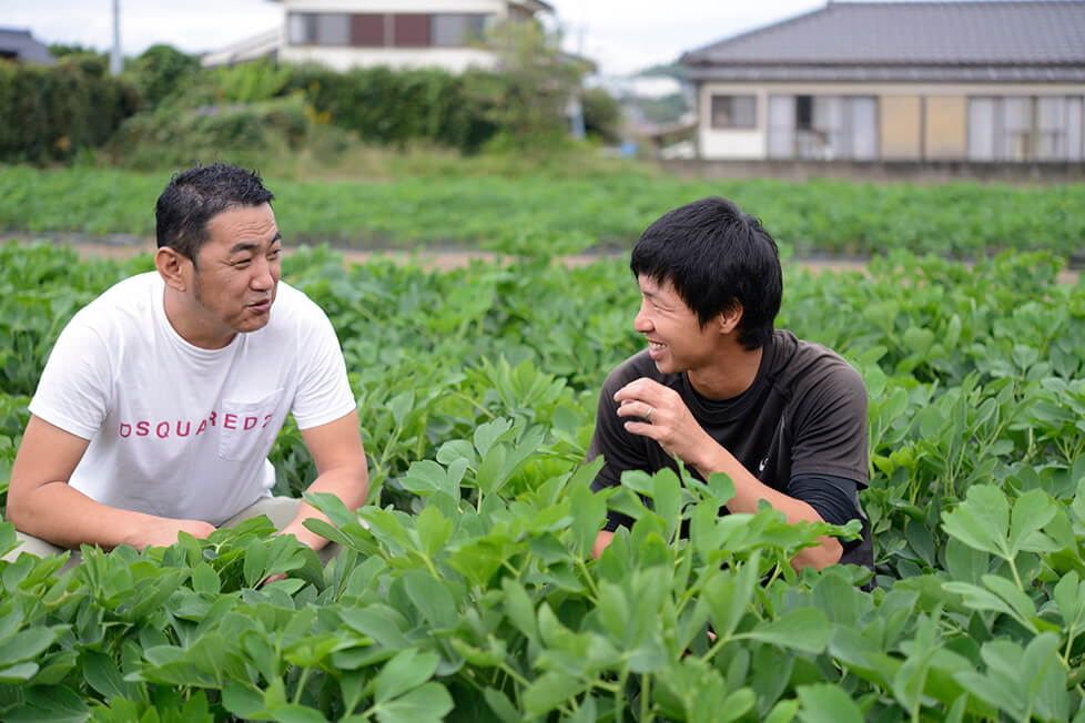 緑の葉が茂る六田農園の畑を訪れ、生産者の六田和志さんとともに座り込んだ橋本さん。「見て、この茎! ブロッコリーやケールのように、太い茎に栄養が蓄えられるから、そこから伸びる葉も旨い」と、やわらかな葉をパクリ。「葉を炒めるのもいいけれど、茎を笹がきにしてお浸しやかき揚げにするのもいいね」。