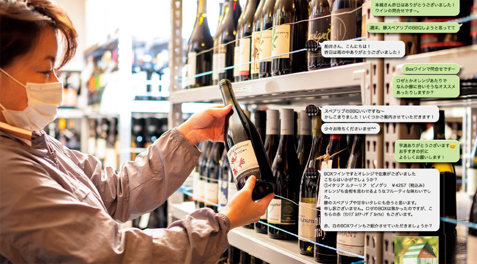 大阪・恵比須にある業務用配送センターでは、8人の社員が常勤し、大阪市内を中心に配送業務を行う。「この倉庫はウチの心臓部です。配送は人の手を介さないと成り立たない仕事。だから昔みたいに低賃金ではなく、配送スタッフには料理長クラスの給料を払っています」。しかし自粛期間中は、業務用卸しの売り上げが激減。対面販売がウリだったショップ部門は、オンライン営業のみに。「人に会えないなら、非対面型ワインショップをやってみよう」と4月初旬に立ち上げたのが、LINE公式アカウント『オンラインソムリエByフジマル』。客はLINEで友達登録をする。メッセージのやりとりはソムリエの資格を持つスタッフが在宅で担当し、客からコメントが入れば即、リアクションする。好みの味わいや、飲むシーンなどをヒアリングしながら、オススメを提案。最終的にはオンラインショップの決済へ導く。「“会う”ということは実際に対面することだけじゃない」。その目論見は、当たった。現在、登録者数は1100人以上。4月の通販全体の売り上げは、昨年1年間の通販売上高の2倍になった。