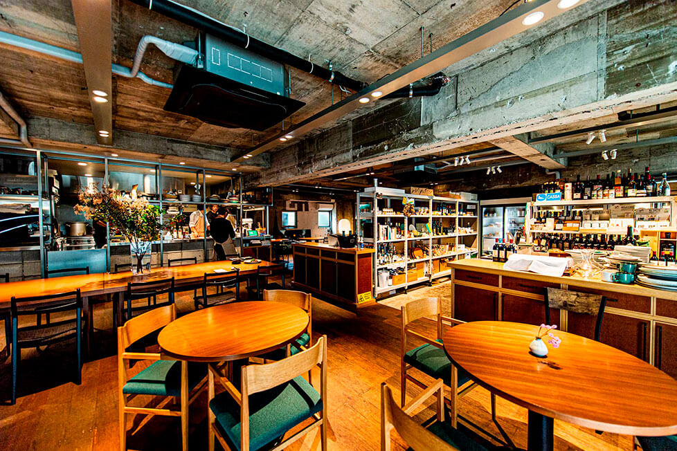 従来のセオリーにとらわれず、自分たちがやりたいことに正直に作り上げたこの店のスタイルは、まるで未来を予見したかのように、今回の危機で強みを発揮した。「季節を映し手間暇かけて作られた食材の素晴らしさや、食を取り巻く様々な課題を、カジュアルなスタイルで伝えたい。その体験を持ち帰り、日々の食卓を少しでも豊かなものにしてもらえたら」。オーナーの塩原弘太さんはじめ、メンバーの思いがそこには詰まっている。ベビーカーも通りやすく、隣を気にせず食事が楽しめるように配した席幅は、ソーシャルディスタンスを保ちやすい空間となり、物販という手段を持つことで自粛中も客との繋がりを保つことができた。「物販をやっていてよかったとつくづく感じた2カ月でした」