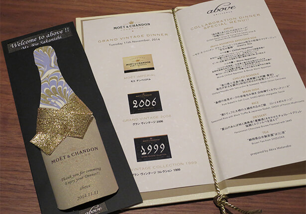 6月のフランス・エペルネでスタートを切ったモエ・エ・シャンドン グラン ヴィンテージが贈る食エクスペリエンス「LE&」。その後、日本のトップシェフやソムリエの面々が自身の店で次々と活動を展開している。前回リポートしたソムリエ田崎真也氏に続き、今回は「AWキッチン」「やさい家めい」でお馴染みの渡邉明シェフによる新店、東京・港区「虎ノ門ヒルズ」にオープンした「Above GRILL & BAR」で行われたスペシャルディナーの模様をリポートする。