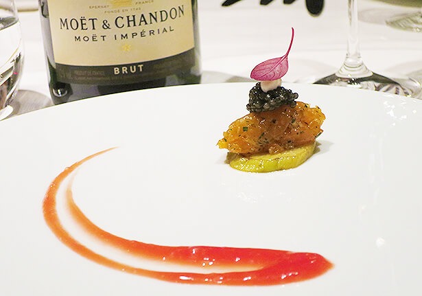 このディナーイベントで提供されたアミューズの2品目、「信州サーモンのタルタル」。ナス、タルタル、上はアキテーヌ産オシェトラキャヴィアをのせた。