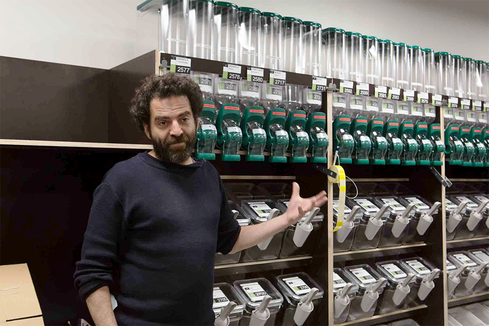 穀物や豆、シリアルの量り売りコーナーに、この日初めて陳列棚が搬入された。担当者のジャン=フランソワさん、「ラ・ルーヴ」設立間もない2011年からのメンバー。誇りに満ちる。