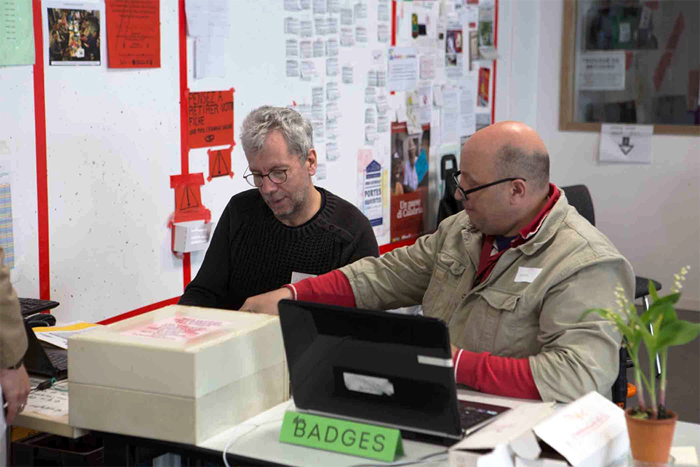買い物に訪れたメンバーを受け入れて説明をし、仕事に来たメンバーにはバッジを渡す受付。受付係も当番制。バッジ担当のカメルさんと受付のジャン=マルクさん。
