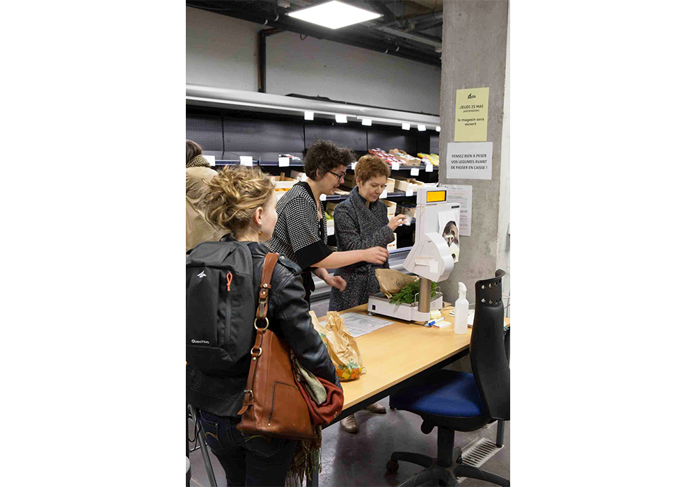 パリ近郊の生産者によるオーガニックの野菜やフルーツが届く生鮮食材量り売りコーナーで。チケットを手配する人と買う人が一緒に作業する。買う人と働く人は仲間という意識が強い。