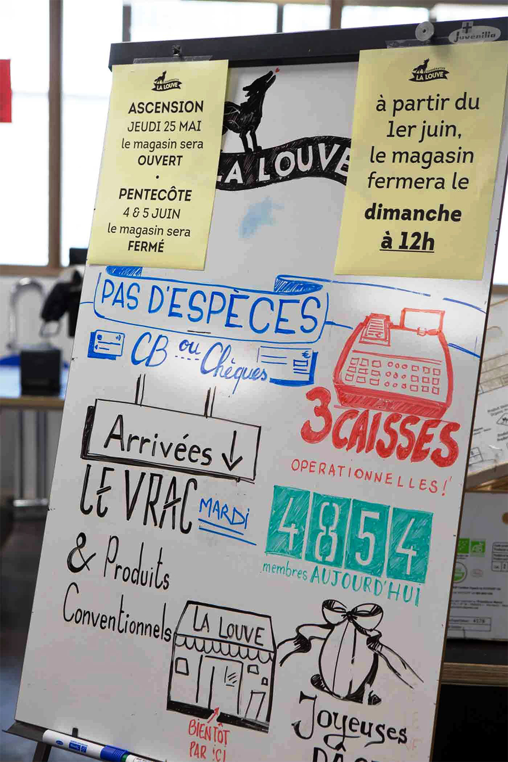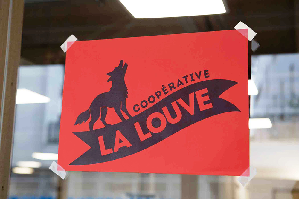 「ラ・ルーヴ」とは「牝狼」の意。「ラ・ルーヴ協同組合」のロゴを、まだ看板のない店外に張り出す。