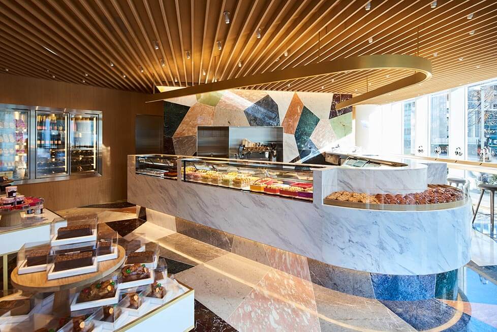 お客さんの方へと迫ってくるショーケースがダイナミック。「高級パティスリーをつくるのではなく、高級パティスリーを通してカルチャーを生み出すことが重要」と語るのは、インテリアデザインを手掛けた「Wonderwall」の片山正通。