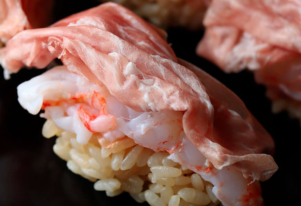 いずれもトロッと甘味が強い、牡丹エビとパルマハムの外モモの相乗効果を楽しむ握り。エビのインパクトに負けないよう、酢飯とエビの間にもパルマハムの外モモを少量挟んでいる。