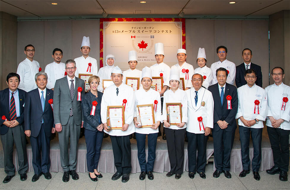 カナダの森が育む天然の甘味料、メープルシロップとメープルシュガー。その魅力と可能性をプロの発想と技術で引き出すべく、第13回「メープルスイーツコンテスト」(クインビーガーデン主催)が開催され、表彰式が2018年11月、東京・港区のカナダ大使館にて行われた。応募総数は188作品。志賀勝栄氏、森田良太氏、柳正司氏、藤本智美氏、藪光生氏、梶山浩司氏が審査した。