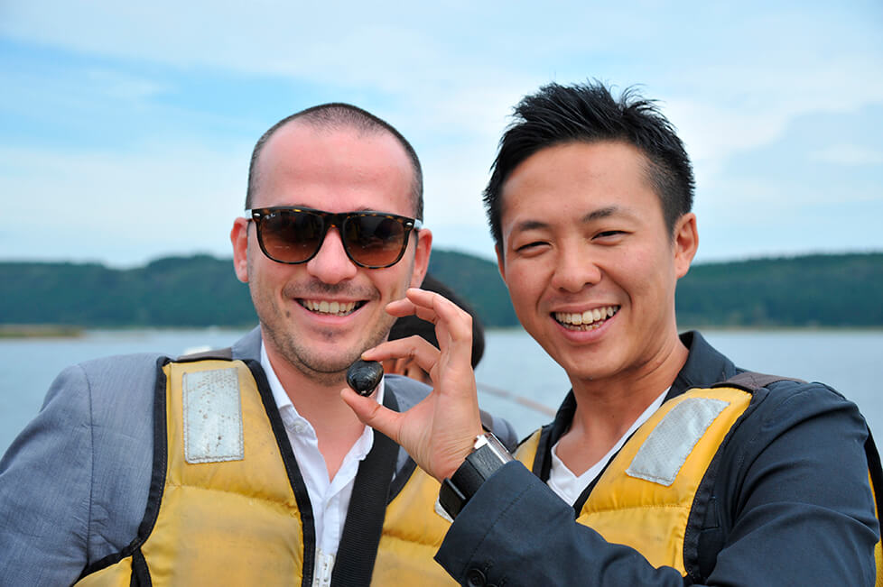 2人は小型漁船に乗り込み、漁師さんと一緒に沖に出ました。「大きなシジミが獲れるのは、この辺り。水深は深いところで20メートル以上あるんです」。手渡されたシジミを見た2人は、驚いた表情で目を見合わせます。殻の大きさは2センチ以上。大振りの身が詰まっています。