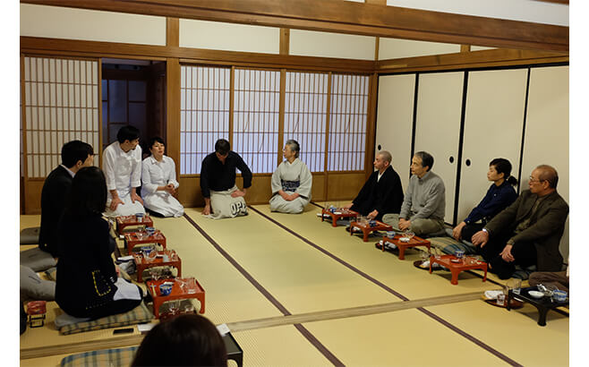 当日は30名を超える、食に関心の高い客が参加。住職のお母様の井上米輝子さんと3人のシェフのご挨拶からスタート。