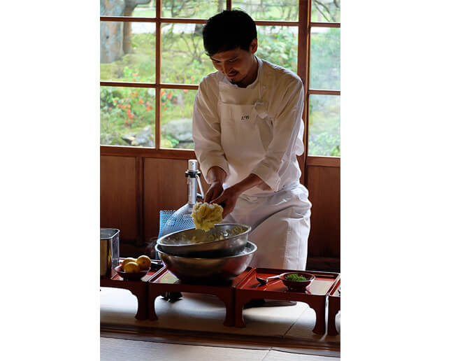 舞台は、春爛漫の北鎌倉。名刹、東慶寺の書院でこの昼の宴は行われた。新鮮な野菜や魚介類に恵まれた鎌倉、そして湘南の地。東慶寺の住職とお母様の井上米輝子さんも、3人のシェフたちに勝るとも劣らない “オープンマインド”の持ち主で、食はもちろん、日頃からさまざまな文化テーマのイベントを積極的に開催している。“シンプル・フード”を体感するこの特別な宴にとってこれほど最適な場所はないと感じさせてくれる会場であった。