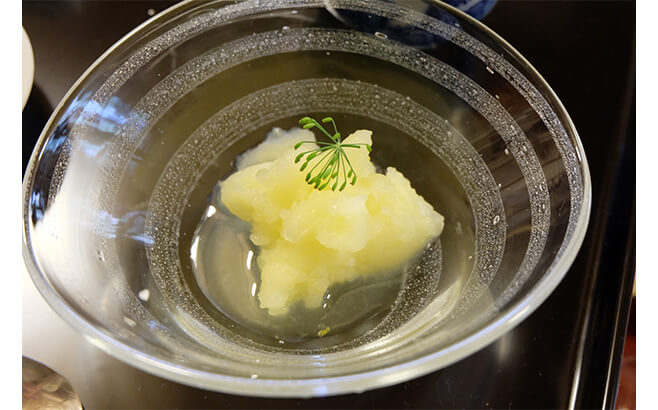 宴のフィナーレのような楽しい演出で作られた「夏みかんのソルベ」。フレッシュな夏みかんの風味を存分に味わえるよう、生江シェフは液体窒素を使用して作った。科学的な調理法は、一見、自然なアプローチと相容れないように思われがちだが、そこには、まず食材と向き合うという本質があり、その実現のために技術が用いられるのである。